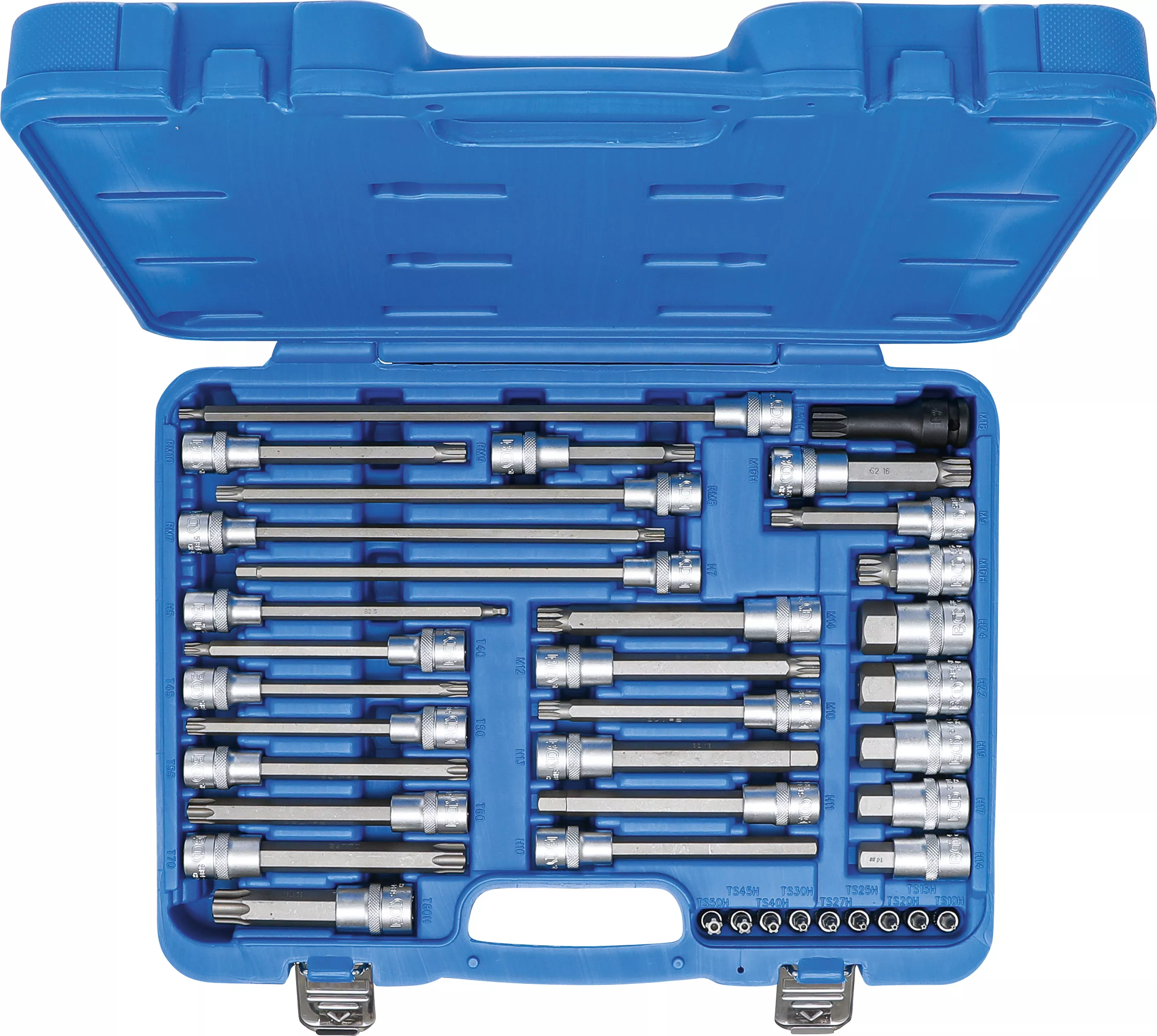 • 6 Capete biţi, acţionare pătrat interior 12,5 mm (1/2"), antrenare cu dantură interioară multiplă (pentru XZN): M9 x 100 mm - M10 x 140 mm - M12 x 140 mm - M14 x 140 mm - M16 x 100 mm (cu gaură) - M16 x 55 mm (cu gaură)