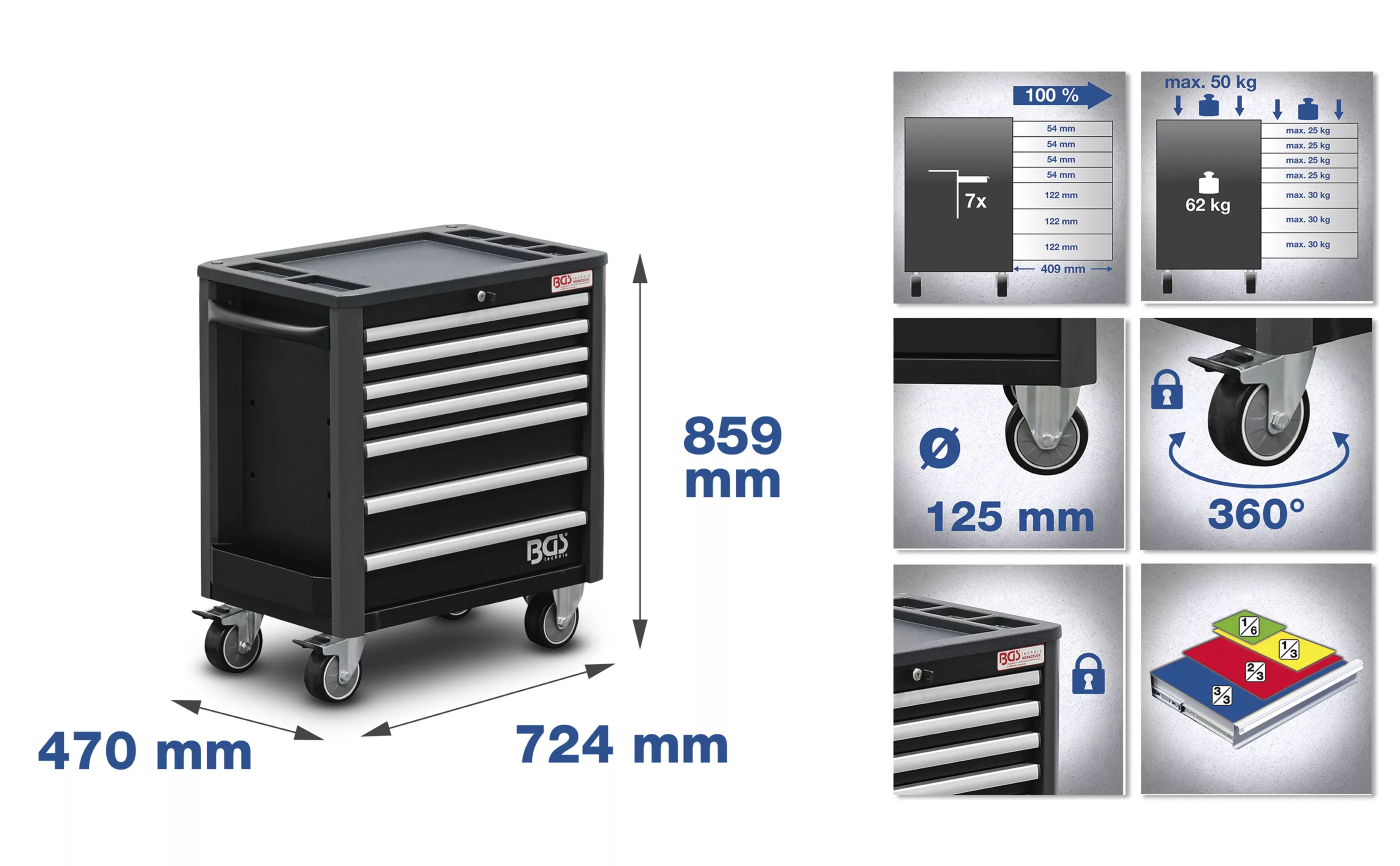 format din cărucior de atelier BGS 4102 incl. 3 suporturi organizatoare pentru cărucior 1/3 (dimensiuni 189 x 408 x 32 mm) şi 1 suport organizator pentru cărucior 3/3 (dimensiuni 567 x 408 x 32 mm) din spumă dură robustă, de înaltă calitate